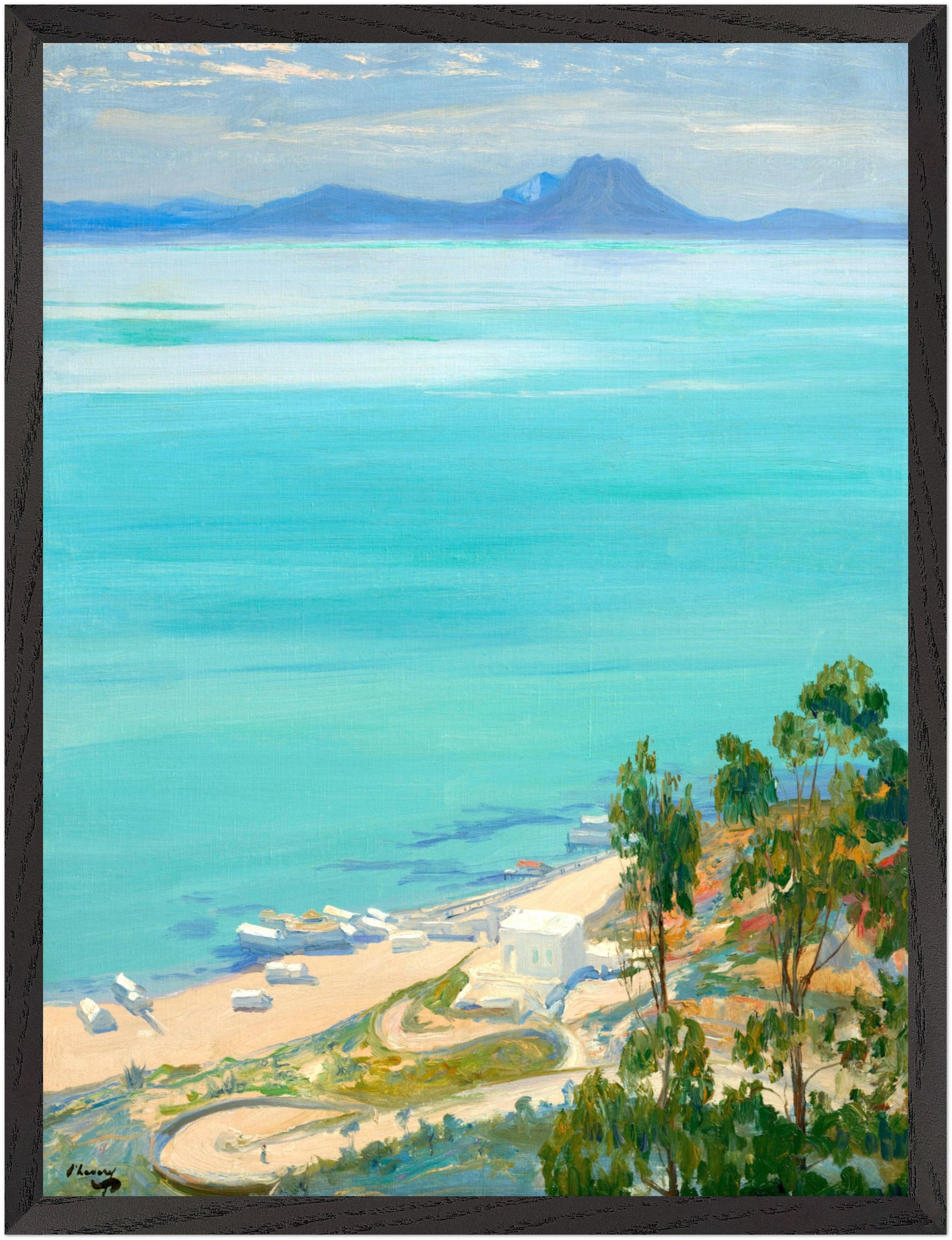The Bay of Tunis, Morning (1919) captures Sir John Lavery’s masterful handling of Mediterranean light and atmosphere. Painted during his stay at the Moorish palace of Dar Ennejma Ezzahra, the composition looks across tranquil turquoise waters toward the distant outline of Mount Bou Kornine, rendered in soft tonal gradation and luminous clarity.